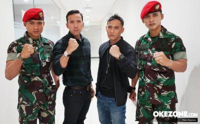 Para pemain film Merah Putih Memanggil, Letnan Dua Eko Jati (kiri), Verdy Bhawanta (kedua kiri), Maruli Tampubolon (kedua kanan) dan Sersan Kepala Sepi Ermawan saat berkunjung ke Redaksi Okezone.com, Gedung MNC News Center, Jakarta, Senin (2/10/2017). Film Merah Putih Memanggil bercerita tentang upaya penyelamatan yang dilakukan anggota Kopassus terhadap para sandera yang disekap oleh teroris. Film ini akan mulai ditayangkan pada 5 Oktober mendatang.