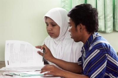 Santri setempat melaksanakan mengaji atau tadarus menggunakan Alquran braille sebagai kegiatan rutin selama Ramadan.