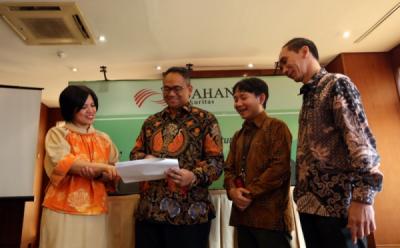 Corporate Secretary PT. Bahana Pembinaan Usaha Indonesia (Persero) ("Bahana") Dewa Agung (ketiga kiri), Perwakilan Milenial Bahana Fitri Istanti (kedua kiri), Suci Wulandari (PKBL Bahana) (kiri) dan Direktur Rumah Sehat Dewi Hapsari Wulandari (jilbab coklat), melihat langsung jalannya operasi katarak gratis di RS Baznas, Jakarta, Rabu 27 Februari 2019. Sebanyak 20 pasien menjalani operasi katarak yang merupakan dalam rangkaian HUT ke-46 Bahana guna membantu masyarakat kurang mampu.