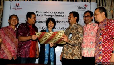 Dari kiri: Mark McGovern (Konsul Jenderal AS di Surabaya), Tri Dewi Virgiyanti (Direktur Perkotaan, Perumahan dan Pemukiman Bappenas), perwakilan warga, Erin E. Mckee (Direktur Badan Pembangunan International Amerika Serikat/USAID), perwakilan warga, Titie Sadarini (Ketua Pelaksana Coca-Cola Foundation Indonesia/CCFI), dan Anizar Firmadi (Direktur Pelayanan PDAM Surabaya) saat meresmikan program master meter untuk air minum di Bubutan Surabaya. Melalui kemitraan dengan USAID IUSWASH PLUS, Coca-Cola melalui Coca-Cola Foundation, mendukung pembangunan sistem master meter dan sekitar 880 rumah tangga di jalan Semarang akan mendapatkan dampak dari program ini.