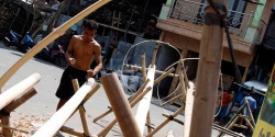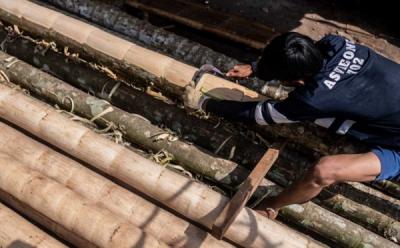 Pekerja menyelesaikan pembuatan pohon pinang di area taman depan Stasiun Manggarai, Jakarta Selatan, Kamis 1 Agustus 2019. Pohon pinang yang biasa digunakan untuk perlombaan HUT Kemerdekaan RI ini dijual mulai dari harga Rp900 ribu hingga Rp1 juta per batang sesuai tingginya.