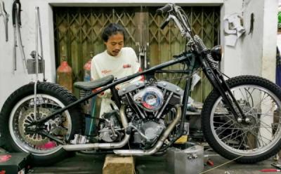 (Dari kiri) suryanation motorland committee yuli tri erwanto, suryanation motorland committee rizky dwianto, builder smoked garage indonesia nicko eigert dan suryanation motorland committee hendyanto berbincang saat puncak acara Suryanation Motorland Battle 2019 di Jakarta, Sabtu (23/11/2019). Acara puncak ini menghadirkan format yang berbeda dengan Suryanation Motorland Battle dan untuk pertama kalinya diadakan di Jakarta.