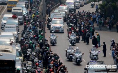 Fotografer mengabadikan mobil jenazah yang membawa almarhum KH Salahuddin Wahid atau Gus Sholah menuju Halim Perdanakusuma dari rumah duka di kawasan Mampang Prapatan, Jakarta, Senin 3 Februari 2020. Gus Sholah meninggal dunia pada hari Minggu 2 Februari 2020 pukul 20.55 WIB setelah menjalani perawatan pascaoperasi jantung di Rumah Sakit Jantung Harapan Kita, Jakarta. Rencananya, jenazah Gus Sholah akan dimakamkan di kompleks pemakaman keluarga yang berada di dalam kawasan Pesantren Tebuireng, Jawa Timur. (Foto: Okezone.com/Arif Julianto)