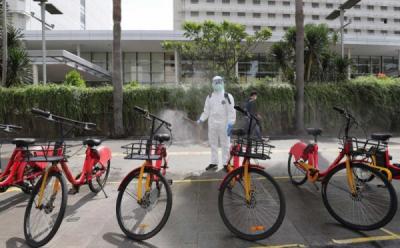 Petugas melakukan penyemprotan disinfektan di Lembaga Pemasyarakatan Salemba, Jakarta, kemarin. Penyemprotan tersebut dilakukan untuk mencegah penyebaran virus Corona atau Covid-19. (Foto: Twitter @kominfotikjp)