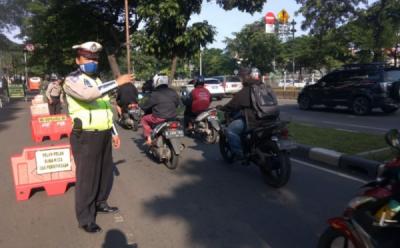 Sejumlah anggota polisi mengarahkan kendaraan untuk keluar Tol Cikarang Barat, di ruas Tol Cikampek, Jawa Barat, Minggu 26 April 2020.Larangan mudik lebaran untuk moda transportasi darat dimulai pada 24 April hingga 31 Mei 2020. Aturan ini diberlakukan sebagai upaya memutus rantai penyebaran corona (Covid-19).