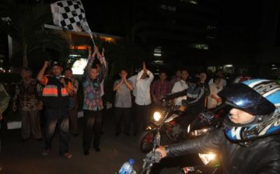 Anggota polisi Sat Lantas Jakarta Utara memberikan makanan untuk sahur kepada warga yang membutuhkan di Jalan RE Martadinata, Jakarta Utara, Minggu 3 Mei 2020.