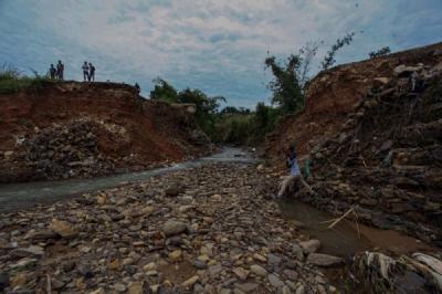 Wisatawan menikmati keindahan alam di lokasi wisata Taman Fathan Hambalang di Citereup, Bogor.