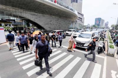 Pejalan kaki saat melintas di trotoar jalan Jenderal Sudirman, Jakarta Pusat. Kamis 4 Maret 2021.