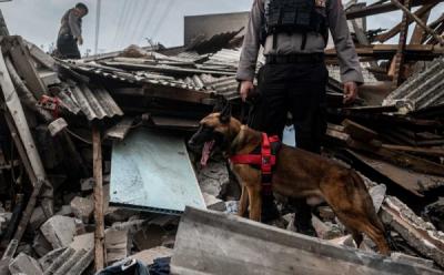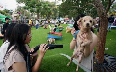 Seekor anjing didampingi pemiliknya mengikuti lomba ketangkasan di Pakuwon City, Surabaya, Jawa Timur, Minggu 28 Maret 2021. Lomba ketangkasan yang mewajibkan peserta melewati 15 rintangan tersebut diikuti 30 anjing berbagai jenis. (ANTARA FOTO/Didik Suhartono) (hru)