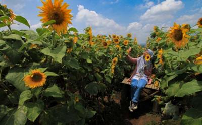 Petani memetik bunga matahari di Desa Padakembang, Kabupaten Tasikmalaya, Jawa Barat, Kamis (19/8/2021). Hasil panen bunga matahari yang diolah menjadi kuaci itu dijual dengan harga Rp18 ribu per kilogram, dan dari lahan seluas satu hektare dapat menghasilkan biji bunga matahari mencapai delapan ton.