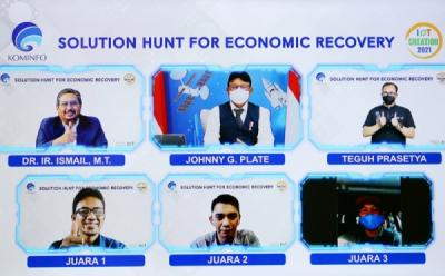 Ketua Umum Asosiasi Internet of Things Indonesia (ASIOTI) Teguh Prasetya, yang juga salah satu juri kompetisi IoT Creation 2021, menyeleksi foto foto bersama juri yang lain, saat penjurian daring Solution Hunt for Economic Recovery, di Jakarta, Sabtu 11 September 2021.