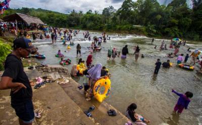 Pengunjung menikmati pemandangan di kawasan Geopark Meratus wisata puncak Tiranggang di Desa Hinas Kiri, Kabupaten Hulu Sungai Tengah, Kalimantan Selatan, Minggu (16/1/2022). Wisata alam yang dikelola oleh Pokdarwis Gunung Bantai Meratus tersebut menawarkan pemandangan alam bentangan Pegunungan Meratus dengan puncak tertingginya yaitu Puncak Halau-Halau dengan ketinggian 1901 mdpl.