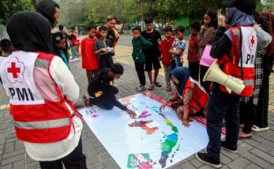 Petugas PMI Solo dibantu relawan menyiapkan menu makan di dapur umum kantor PMI Solo, Jawa Tengah, Minggu 6 Maret 2022.