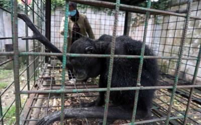 Dalam aksinya mereka mendesak pemerintah segera melarang praktik perdagangan satwa liar monyet ekor panjang yang marak terjadi di pasar hewan dan secara daring di Indonesia. (ANTARA FOTO/Sigid Kurniawan) (ddk)