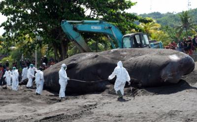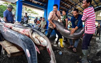 Warga Evakuasi Hiu Paus yang Mati Akibat Terjerat Jaring Nelayan