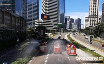 Petugas Evakuasi Mobil Pemadam Kebakaran yang Terbalik di Jalan Sudirman