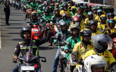 Sejumlah pengemudi ojek online (ojol) melakukan konvoi saat berunjuk rasa di alun-alun Serang, Banten, Senin 12 September 2022.
