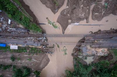 Seorang guru melihat kondisi bangunan sekolah yang amblas di SD Negeri 2 Keramatmanik, Pandeglang, Banten, Sabtu (8/10/2022). Sebanyak dua ruang kelas sekolah tersebut amblas pada dinding bangunannya akibat pergerakan tanah yang disebabkan oleh hujan deras mengguyur kawasan itu pada Jumat (7/10/2022).