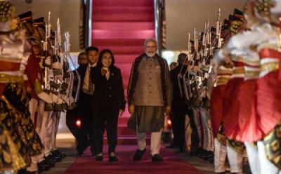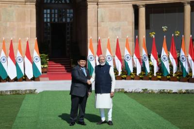 Presiden Joko Widodo (tengah) menyerahkan palu kepemimpinan G20 kepada Perdana Menteri India Narendra Damodardas Modi (kiri).