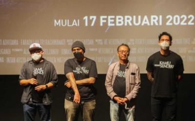 (ki-ka) Operation Direktur MNC Pictures Endah Hari Utari, Head of Drama 5 MNC Pictures Yudo Indroyono dan Sutradara Mentari dan Jinny Effizen berfoto usai pemotongan tumpeng dalam acara syukuran sinetron Mentari dan Jinny di Cibubur, Jakarta, Senin 5 Desember 2022.