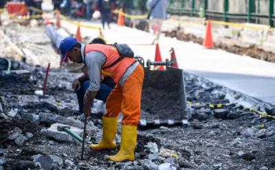 Pekerja menyelesaikan proyek revitalisasi pedestrian di Jalan Medan Merdeka Selatan, Jakarta, Kamis (5/1/2023). Dinas Bina Marga DKI Jakarta merevitalisasi sejumlah trotoar di Jakarta untuk kenyamanan pejalan kaki yang ditargetkan selesai pada akhir Januari 2023.