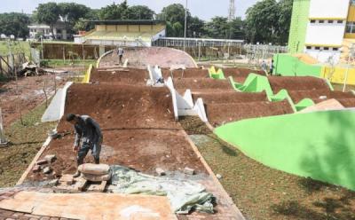 Petugas Dinas Pertamanan dan Kehutanan melakukan perawatan area skateboard di Ruang Publik Terpadu Ramah Anak (RPTRA) Kalijodo, Jakarta, Jumat 20 Januari 2023.
