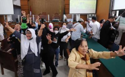 Terdakwa Richard Eliezer alias Bharada E memberi salam kepada pengunjung sebelum dimulainya sidang kasus pembunuhan berencana terhadap Brigadir Nopriansyah Yosua Hutabarat di Pengadilan Negeri Jakarta Selatan, Jakarta, Rabu (15/2/2023). Sidang beragenda pembacaan vonis bagi terdakwa Richard Eliezer alias Bharada E yang sebelumnya dituntut dua belas tahun penjara oleh Jaksa Penuntut Umum (JPU).
