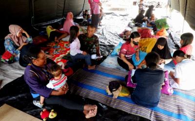 Petugas menata kantong bantuan dari Presiden Joko Widodo berisi sembako untuk korban gempa bumi Jayapura di posko induk pengungsian di Kantor Wali Kota Jayapura, Papua, Rabu 15 Februari 2023.