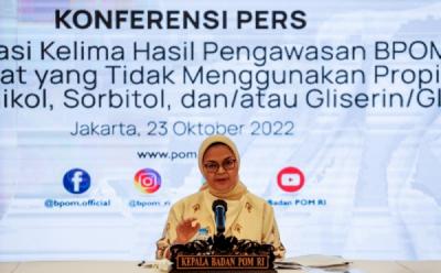 Kepala Badan Pengawas Obat dan Makanan (BPOM) Peni Kusumastuti Lukito (tengah) dan jajarannya menunjukkan bahan dan kosmetik ilegal berbahaya dalam konferensi pers penggerebekan pabrik di kompleks pergudangan Elang Laut, Kamal Muara, Penjaringan, Jakarta, Kamis 16 Maret 2023.