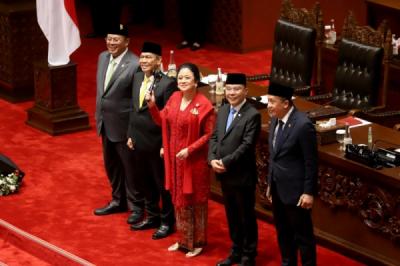 Ketua DPR Puan Maharani (tengah) berfoto bersama Wakil Ketua DPR Rachmat Gobel (kiri), Lodewijk Freidrich Paulus (kedua kiri), Sufmi Dasco Ahmad (kanan) dan Calon Gubernur Bank Indonesia Perry Warjiyo saat Sidang Paripurna DPR ke-19 Masa Persidangan IV Tahun Sidang 2022-2023 di Kompleks Parlemen, Senayan, Jakarta, Selasa 21 Maret 2023.