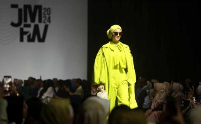 Model tampil mengenakan busana koleksi Mandjah by Ivan Gunawan dalam Ramadhan Runway 2023 di Jakarta, Sabtu 15 April 2023.