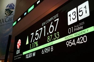 Pekerja berada di depan layar yang menampilkan pergerakan Indeks Harga Saham Gabungan (IHSG) di Bursa Efek Indonesia, Jakarta, Rabu (26/4/2023). Usai cuti bersama Lebaran 2023, Indeks Harga Saham Gabungan (IHSG) pada Rabu (26/4) dibuka menguat 60 poin (0,88 persen) ke 6.877.