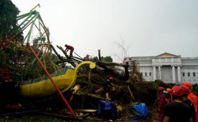 Warga mengumpulkan puing-puing bangunan warung yang tertimpa pohon munggur yang roboh di lokasi wisata Umbul Langse, Teras, Boyolali, Jawa Tengah, Rabu (3/5/2023). Pohon munggur besar yang diperkirakan berusia ratusan tahun itu tumbang menimpa area Umbul Langse, warung, dan merusak pipa saluran air.