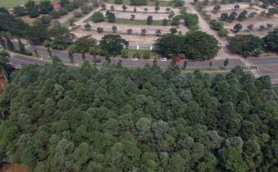 Foto udara hutan kota Pakansari, Cibinong, Kabupaten Bogor, Jawa Barat, Jumat (2/6/2023). Keberadaan hutan kota di Kawasan Stadion Pakansari Cibinong diproyeksikan menjadi paru-paru Kabupaten Bogor, selain menjaga kelestarian, hutan kota bisa menjaga keserasian dan keseimbangan ekosistem di perkotaan.