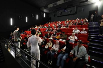 Pengunjung menaiki becak saat menonton film pada drive in cinema dengan becak di Kridosono, Yogyakarta, Minggu (9/7/2023). Drive in cinema merupakan rangkaian dari Kotabaru Heritage Festival yang menawarkan pengalaman menonton film menaiki becak dengan nuansa zaman dahulu.