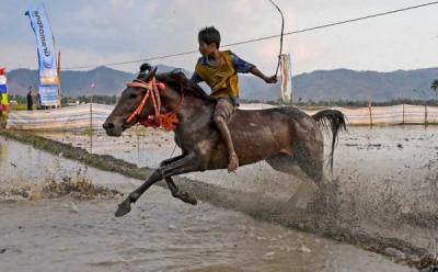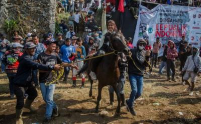 Joki Adu Cepat saat Lomba Pacuan Kuda Tradisional Gayo