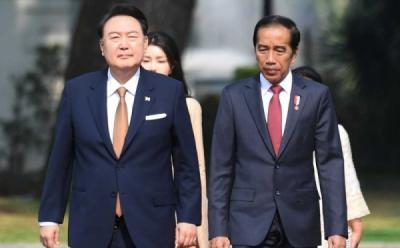 Presiden Korea Selatan Yoon Suk-yeol dan Ibu Kim Keon-hee menghadiri acara Gala Dinner KTT ke-43 ASEAN di Hutan Kota Plataran, Kompleks GBK, Senayan, Jakarta, Rabu (6/9/2023). Ibu Negara Korsel Kim Keon-hee terlihat sangat cantik dan menawan dengan setelan pakaian yang dipadupadankan dengan batik.