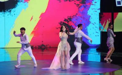 Penyanyi Happy Asmara saat tampil dalam konser HUT GTV Amazing 21 di Studio RCTI+, Kebon Jeruk, Jakarta, Minggu (8/10/2023).