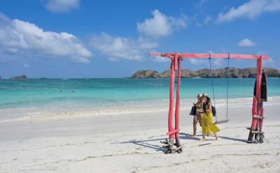 Pengunjung menikmati suasana pantai berpasir putih di Pantai Kandapute, Kabupaten Morowali, Sulawesi Tengah, Minggu (22/10/2023). Pulau yang ditempuh dengan menggunakan jasa taksi laut dengan waktu sekitar 15 menit tersebut ramai pengunjung saat akhir pekan.