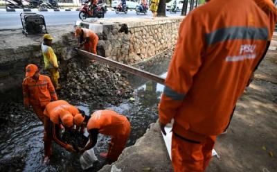 Petugas PPSU menyiram tanaman cabai di samping RPTRA Payung Tunas Teratai, Cipayung, Jakarta, Rabu (8/11/2023). Pemerintah Provinsi DKI Jakarta meminta setiap lahan kosong milik Pemprov yang ada untuk ditanami tanaman pangan seperti cabai, terong, kacang tanah, kangkung, dan anggur guna menjaga ketahanan pangan dari dampak EL Nino.