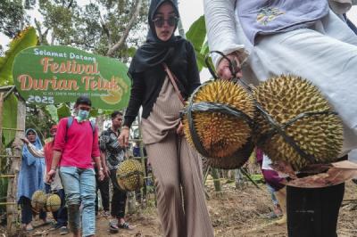 Calon presiden nomor urut 3 Ganjar Pranowo (kanan) mencicipi buah durian di Desa Wilayu, Selomerto, Wonosobo, Jawa Tengah, Senin (18/12/2023). Dalam safari politik di Wonosobo, Ganjar Pranowo menyempatkan diri untuk mencicipi buah durian saat musim panen di kawasan tersebut.