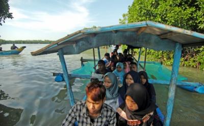 Pengunjung berjalan di objek wisata hutan mangrove Desa Matansala, Kabupaten Morowali, Sulawesi Tengah, Kamis (28/12/2023). Objek wisata milik desa tersebut menjadi salah satu tujuan wisata daerah dan keberadaannya menjadi salah satu sumber penghasilan bagi desa dan UMKM sekitar. ANTARA FOTO/Mohamad Hamzah/rwa.