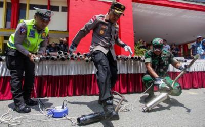 Wali Kota Tegal Dedy Yon Supriyono (tengah) didampingi Kapolres Tegal Kota AKBP Rully Thomas (kanan) memotong knalpot brong saat pemusnahan knalpot brong di Polres Tegal Kota, Jawa Tengah, Kamis (11/1/2024). Polres Tegal Kota memusnahkan sebanyak 524 buah knalpot tidak standar (brong) dan mengamankan 524 kendaraan bermotor yang tidak standar sebagai tindakan tegas agar pengendara lebih mematuhi tata tertib dan keselamatan berlalu lintas. ANTARA FOTO/Oky Lukmansyah/nz