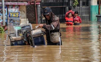 Foto udara warga berjalan melewati genangan banjir di Dayeuhkolot, Kabupaten Bandung, Jawa Barat, Jumat (12/1/2024). Sedikitnya lima kecamatan di kawasan Bandung Selatan, Kabupaten Bandung terendam banjir setinggi 50 cm hingga 2 meter akibat meluapnya aliran Sungai Citarum yang terjadi pada Kamis (11/1) malam. ANTARA FOTO/Novrian Arbi/tom.
