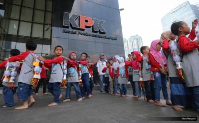 Aktivis antikorupsi dari Pasukan Koar Koar (PKK) bernyanyi dalam aksi bertajuk Korupsong saat berlangsungnya Hari Bebas Kendaraan Bermotor (HBKB) di kawasan Bundaran HI, Jakarta, Minggu (4/2/2023). Aksi tersebut untuk mengajak warga agar tidak memilih para calon anggota legislatif yang merupakan mantan narapidana kasus korupsi pada Pemilu 2024. ANTARA FOTO/Aprillio Akbar/Spt.