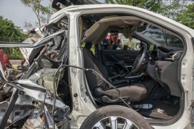 Polisi melihat kondisi mobil yang menabrak separator jalur sepeda di Jalan Thamrin, Jakarta, Selasa (6/2/2024). Kecelakaan yang menyebabkan kendaraan rusak ringan itu terjadi akibat kelalaian pengendara mobil yang mengantuk. ANTARA FOTO/Reno Esnir/nym.