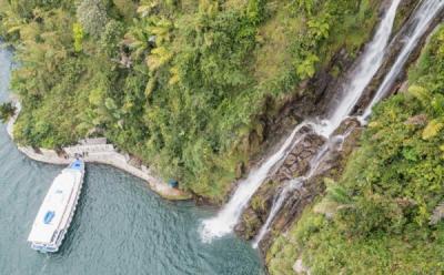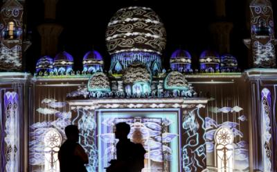 Pengunjung berfoto saat pertunjukan video mapping wonderspace imersif di Stasiun MRT Bundaran HI, Jakarta, Senin (3/6/2024). Pertunjukan video mapping wonderspace imersif itu menampilkan lima destinasi wisata super prioritas di Indonesia yaitu, Candi Borobudur, Danau Toba, Likupang, Mandalika dan Labuan Bajo, sebagai upaya meningkatkan kunjungan wisatawan nusantara.