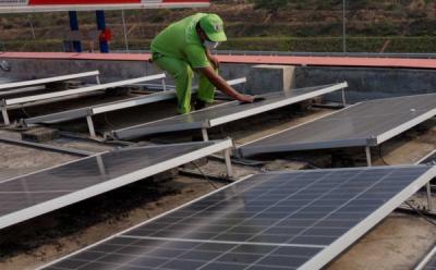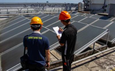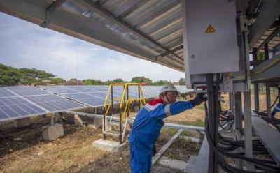 Teknisi melakukan pemeriksaan panel surya di Gedung Dirjen Ketenagalistrikan Kementerian ESDM.