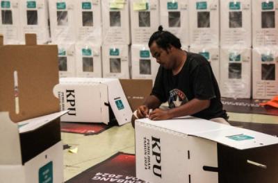 Pekerja melipat surat suara Pemilihan Gubernur Bali 2024 di Gudang Logistik KPU Tabanan.