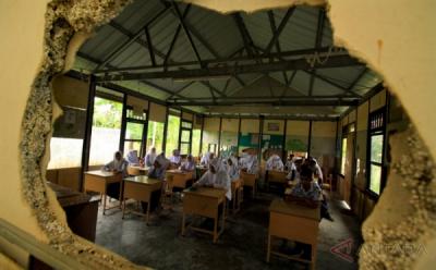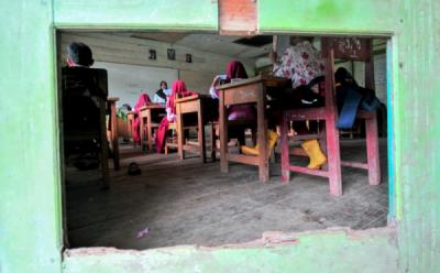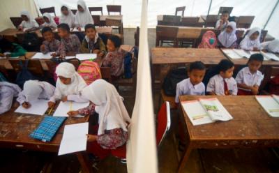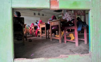 Siswa mengikuti kegiatan belajar mengajar dengan sekat papan antarkelas di Madrasah Ibtidaiyah Swasta Kutakarang, Pandeglang, Banten, Rabu (20/11/2024). Sekolah yang berada di pelosok Kabupaten Pandeglang dengan siswa sebanyak 80 orang tersebut kondisinya minim prasarana seperti tidak memiliki ruang kelas yang memadai, tidak memiliki toilet, tidak ada sarana perpustakaan dan hingga kini belum mendapatkan bantuan dari pemerintah daerah.